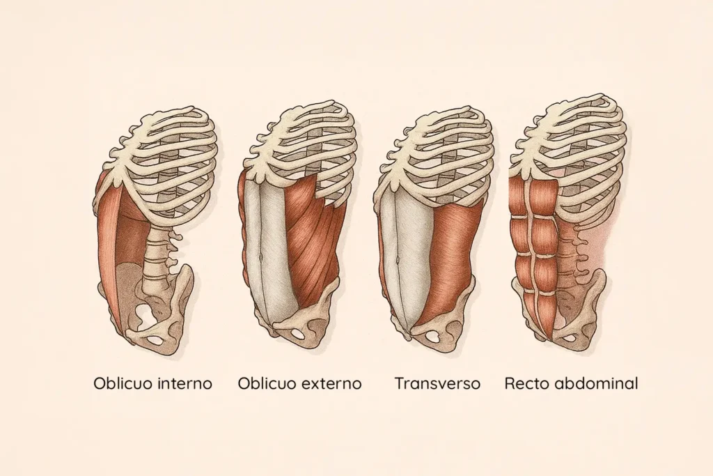 Los oblicuos externos, ubicados más superficialmente, favorecen también la respiración controlada y voluntaria.